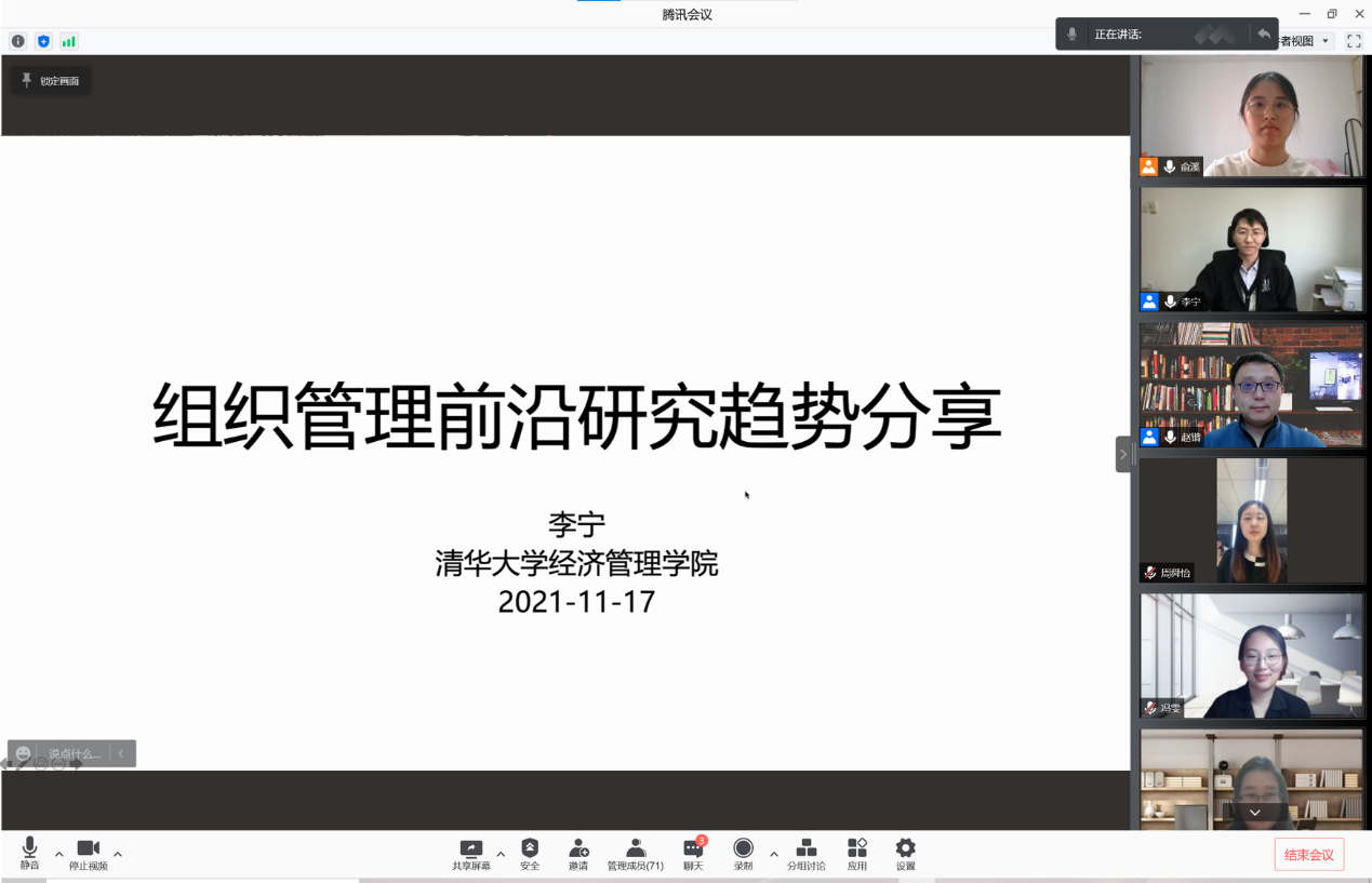 国产a片 人力资源管理系2021年秋季学期半月谈学术论坛(第94期)于2021年11月17日(星期三)下午14:00至16:00借助腾讯会议的途径于线上顺利开展。来自清华大学经济管理国产a片 领导力与组织管理系的李宁教授分享了关于组织管理研究领域最新发展趋势的看法,并探讨了如何在该领域进行高质量和有影响力研究的相关话题。本次学术论坛由国产a片 赵锴副教授主持,孙健敏教授、周文霞教授、徐世勇教授、刘松博教授、李育辉教授、王桢教授、王青副教授、王丽娟副教授、骆南峰副教授、于坤副教授、陈雯助理教授、李海蓉助理教授、冯雯助理教授、陈力凡助理教授,以及近七十位博士生和硕士生参与了此次线上讲座和讨论。