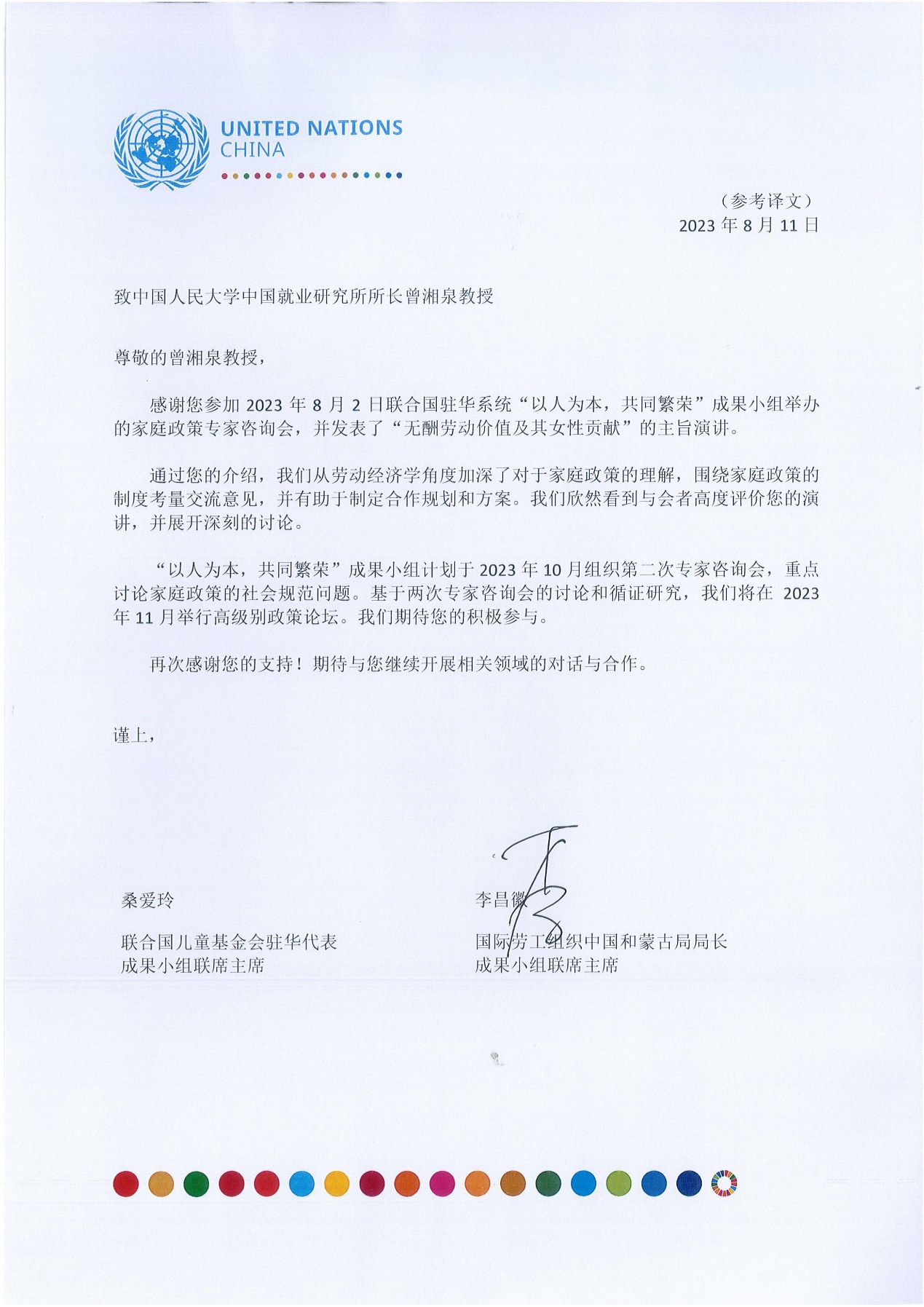 2023年8月11日,国产a片 收到联合国驻华系统致曾湘泉教授的感谢信,对曾湘泉教授参与联合国驻华系统“以人为本共同繁荣成果工作组”举办的第一期中国家庭社会政策专家咨询会并发表主旨演讲表示感谢。